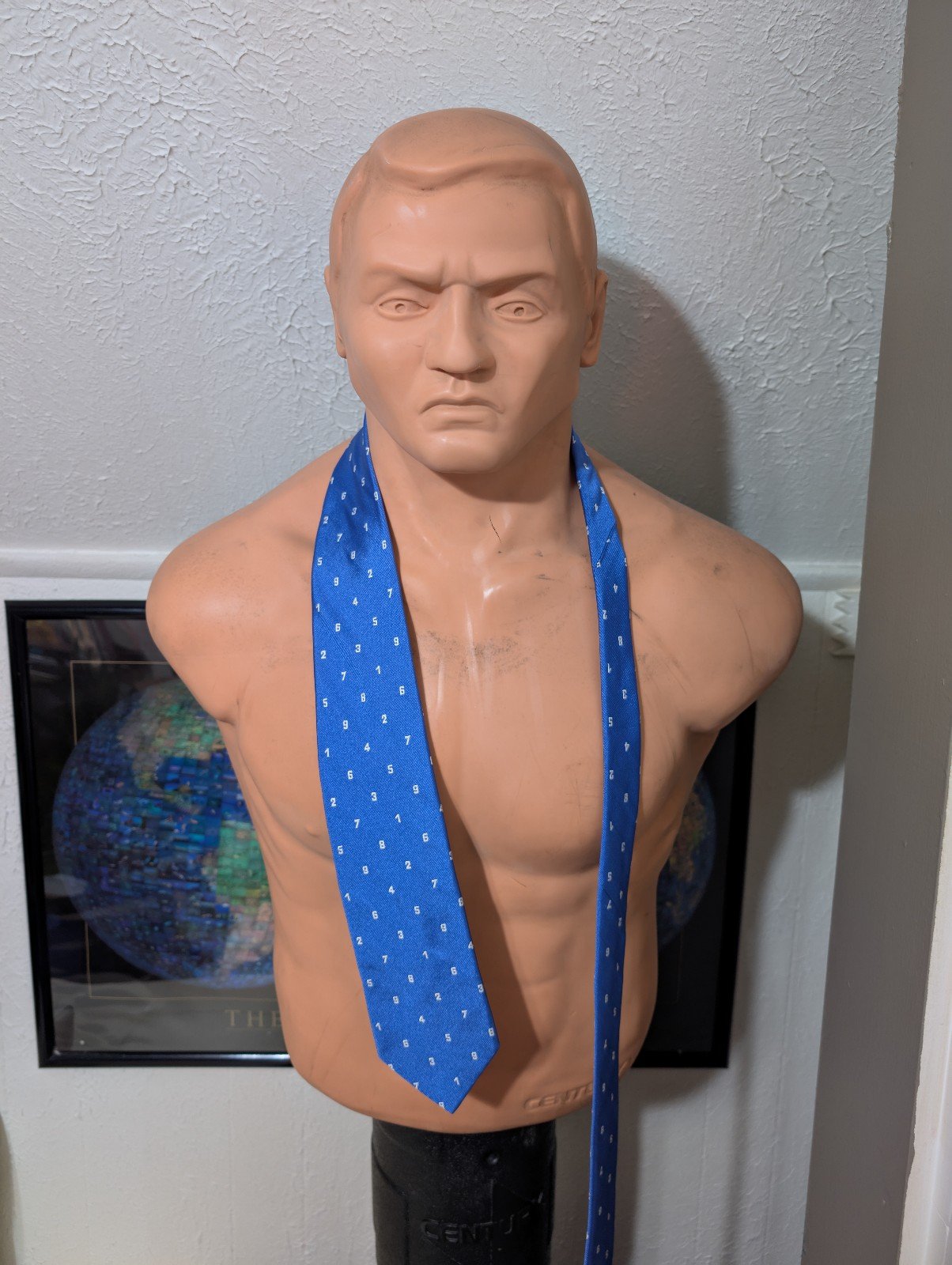Striking blue tie made in Italy from 100% silk featuring an eye-catching all-over white number pattern that gives off both luxury and playful intellect. Smooth woven texture with a modern width and high-end stitched detail, perfect for standout formal wear or a sharp creative twist to office attire. Ideal for collectors of unique designer menswear, fashion-forward stylists, or anyone who appreciates subtle statement pieces. Measurements are approximately 61&1/2" long and 3&1/4" wide. No pets and non smoking home.