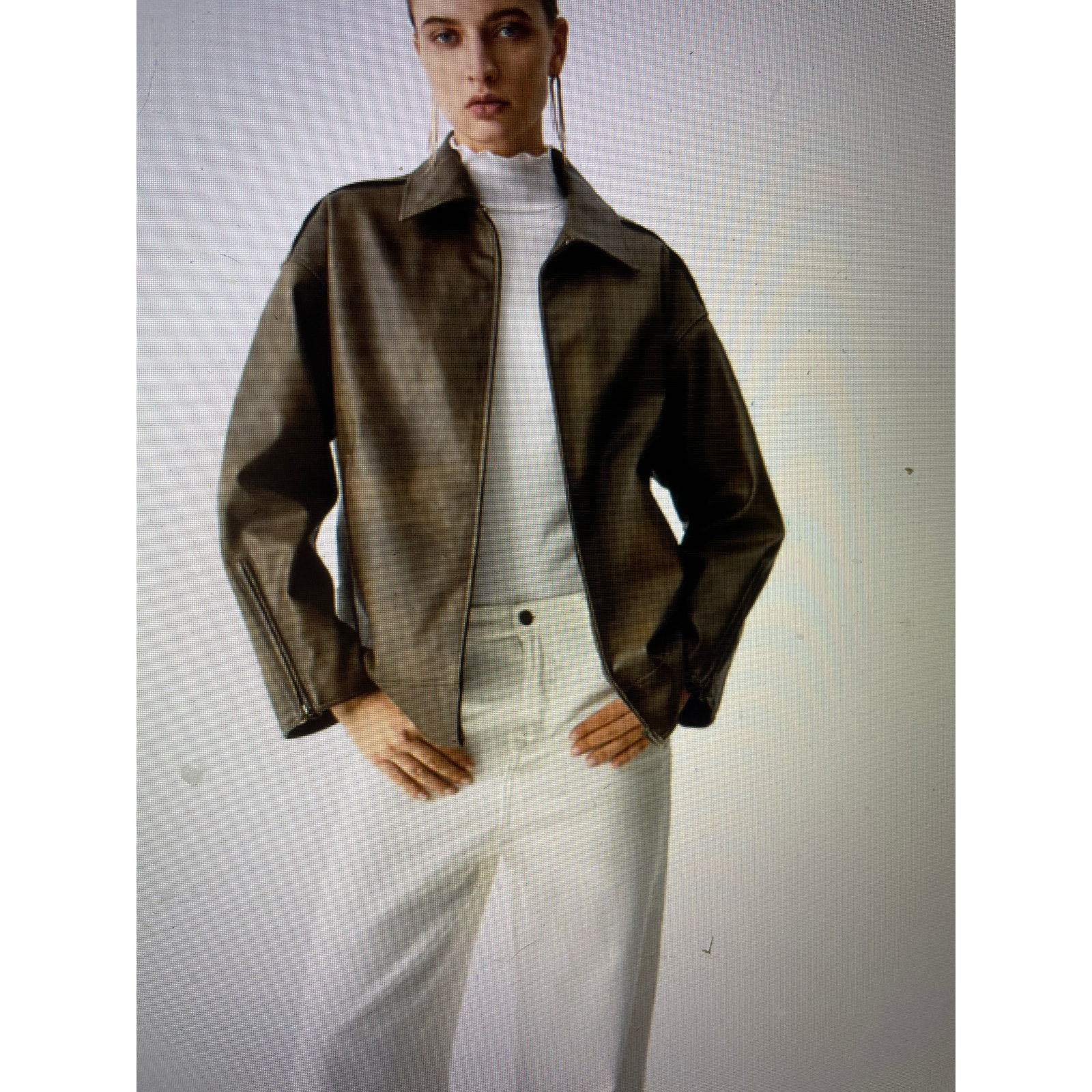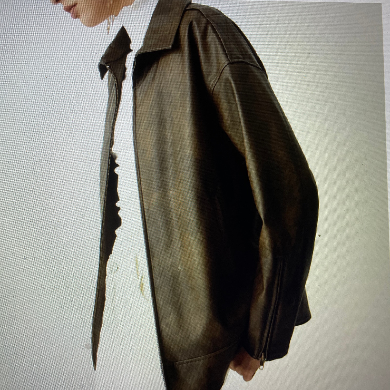 Jacket Faux Leather Relaxed Fit Boxy Dark Chocolate Brown Double Pockets Zipper accent long sleeves collar XL or 12