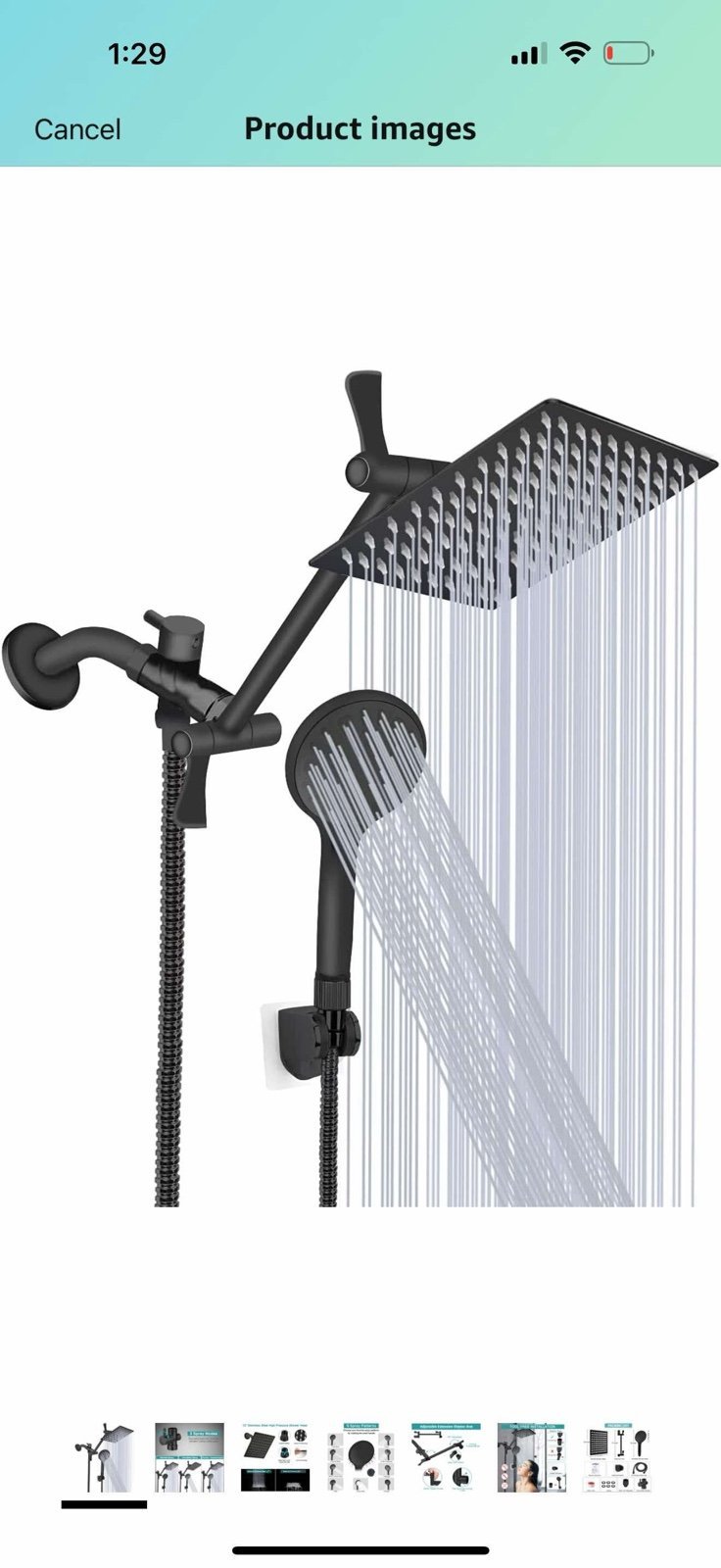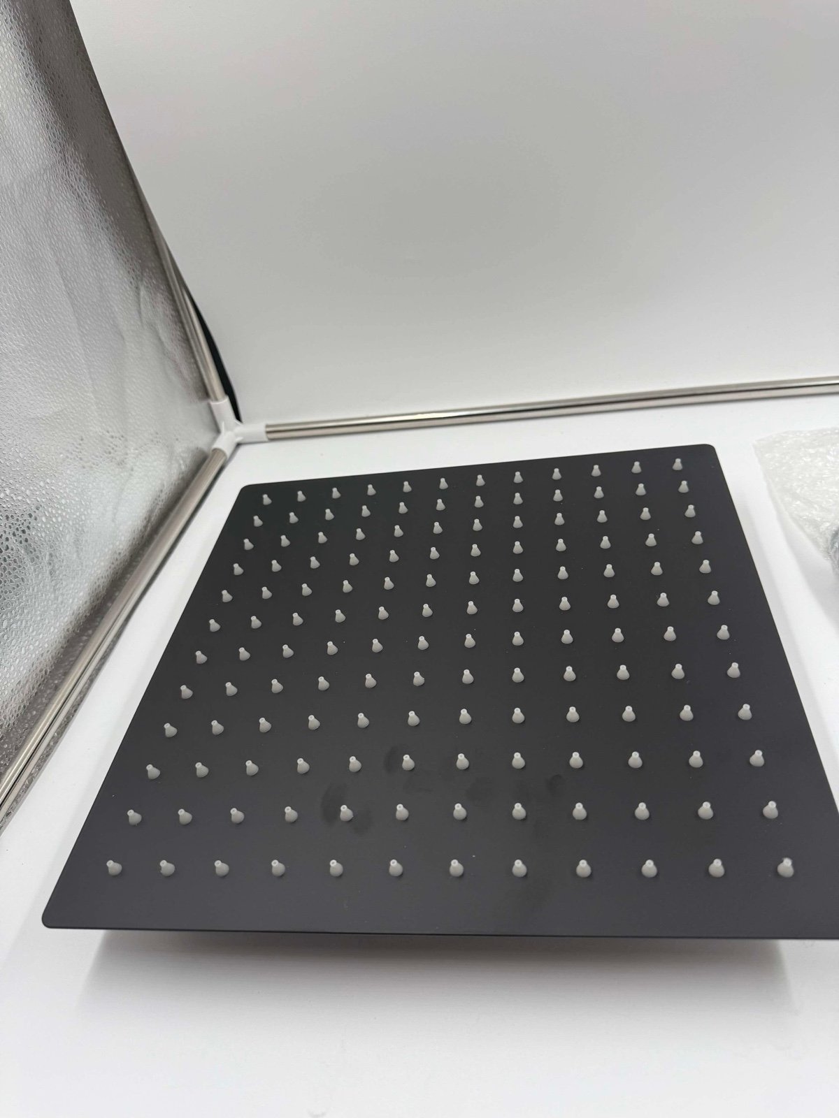 This shower head set includes a 12-inch wall-mounted rainfall shower head in matte black stainless steel with high pressure features. It comes with a handheld shower combo and an 11-inch extension. The modern style shower head is suitable for showers and has a single faucet hole design. It is designed for a bathroom and measures 11 inches in length and 12 inches in width. The brand is Tudoccy. Open box but new all sealed inside