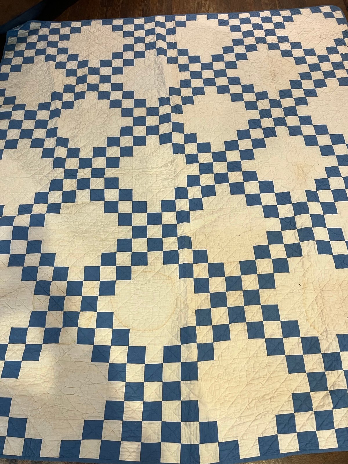 Vintage Irish chain blue & white quilts - these are fraternally matching - purchased at same estate sale- one quilt is 79 by 89 - hand quilted - I have not laundered so please look carefully at pics - one stain - binding fraying