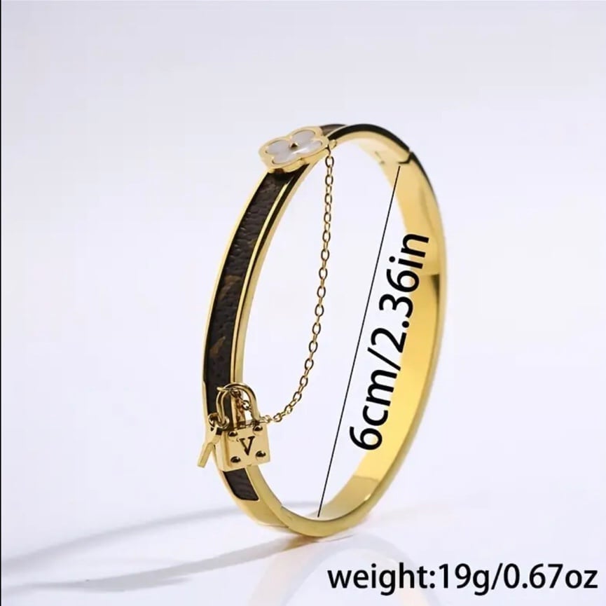 Women’s Gold Plated Stainless Steel Bangle Bracelet White Clover Locked Key